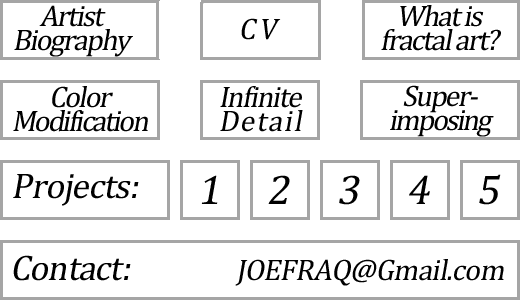 Artist Biography CURRICULUM VITAE What is Fractal Art Color Modifications Infinite Detail Superimposed Examples Project 1 Project 2 Project 3 Project 4 Project 5
